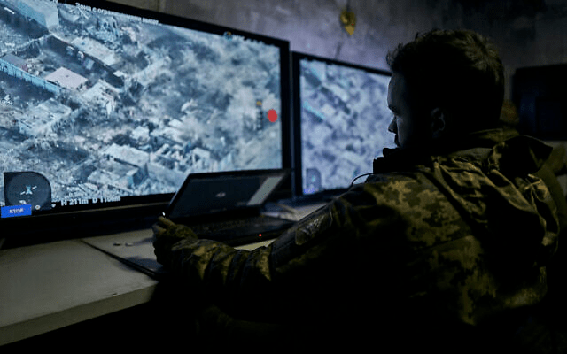 A Ukrainian soldier watches a drone feed from an underground command center in Bakhmut, Donetsk region, Ukraine, Sunday, Dec. 25, 2022. (AP/Libkos)