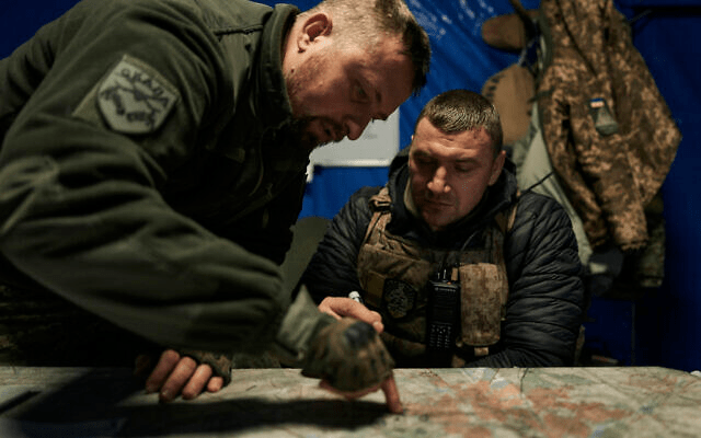 Ukrainian soldiers look at a map in underground command center in Bakhmut, Donetsk region, Ukraine, Sunday, Dec. 25, 2022. (AP/Libkos)