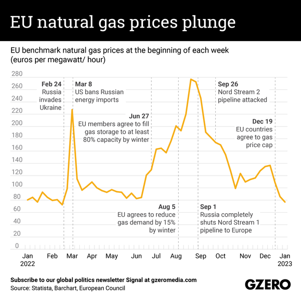 For months, Europe has been bracing for an energy crisis as it weans itself off Russian oil and natural gas amid the ongoing onslaught in Ukraine. But Mother Nature has given European countries a helping hand in recent weeks by keeping temperatures mild across much of the Northern Hemisphere – and reducing demand for gas needed to heat homes. As a result, the Dutch gas trading exchange – a benchmark for measuring natural gas prices – has plummeted by 80% from an August high and is now below pre-war levels. This is a welcome development for European governments that have already taken measures to curb consumption and shield consumers from high prices. We take a look at European natural gas prices since Jan. 2022.