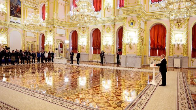 Putin met new ambassadors from 17 countries in Kremlin yesterday. Note the distance – as paranoid as in historical anecdotes about paranoid dictators…