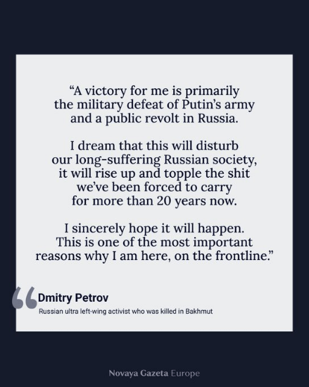 Dmitry Petrov is a Russian ultra left-wing activist and anarchist who fought for Ukraine and was killed in Bakhmut a month ago. This is what he said in an earlier interview when asked what he sees as victory:
