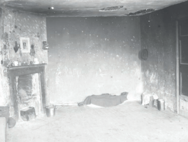 He described how ‘the great old rooms’ inside these tenements were bereft of all furniture save the most miserable makeshifts, with the faded paper of two generations back peeling off the high walls in long ribbons because of the damp; with holes in the flooring so that you had to mind your step and the laths showing through the broken plaster in the ceilings. What beds! What dirt!