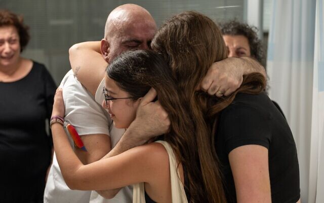 Israeli hostages pictured after their rescue from Hamas captivity in Gaza on June 8, 2024. From left: Shlomi Ziv (IDF); Andrey Kozlov and Almog Meir Jan (Avshalom Sassoni/Flash90), and Noa Argamani (Courtesy)