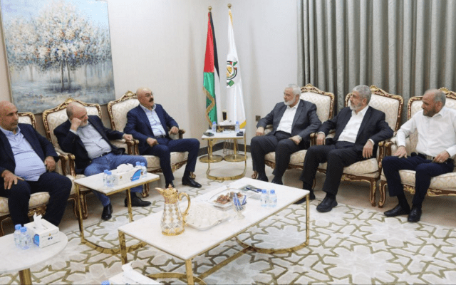 Hamas leader Ismail Haniyeh (third right), and top official Khalem Mashaal (second right), are seen meeting with Fatah’s Nasser al-Qudwa (second left) and Samir al-Mashrawi (third left) in Qatar on November 22, 2023. (Courtesy)