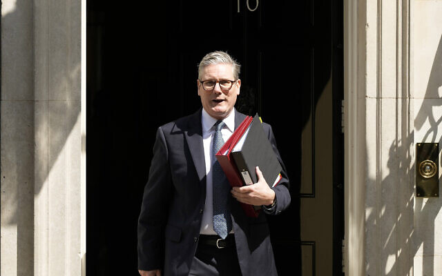 Britain’s Prime Minister Keir Starmer leaves 10 Downing Street to attend the weekly Prime Ministers’ Questions session in parliament in London, July 24, 2024. (AP/Frank Augstein)