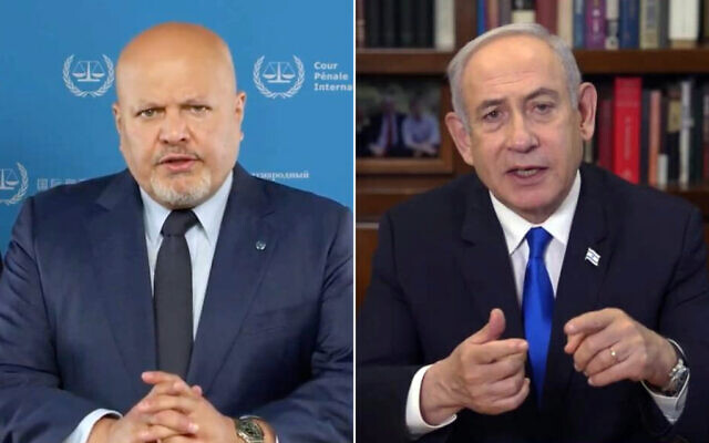 Karim Khan, the chief prosecutor of the International Criminal Court (left), announces he is seeking arrest warrants from the court’s judges for Prime Minister Benjamin Netanyahu and Defense Minister Yoav Gallant, along with Hamas leaders Yahya Sinwar, Mohammed Deif and Ismail Haniyeh (ICC); Prime Minister Benjamin Netanyahu delivers a video address, May 20, 2024. (Screenshot/GPO)