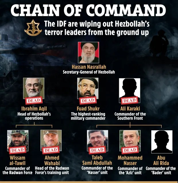 And over the past 11 months, Israel eliminated nearly all of the terror group’s leadership, leaving Hassan Nasrallah alone at the top as he is reportedly hidden in a 50ft deep bunker.
