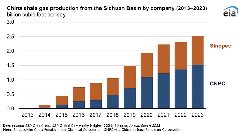 According to a report from S&P Global Commodity Insights (SPGCI), the China National Petroleum Corporation (CNPC) in 2023 produced natural gas from shale in the Low Cambrian formation in the Sichuan Basin at a depth exceeding 14,760 feet, marking the first time that commercially viable natural gas was produced from this deeper formation. SPGCI reported that the Zi 201 well initially produced 26.1 million cubic feet per day (MMcf/d), a commercial rate that could signify the entry of the Cambrian formation into a new phase of large-scale shale gas development.