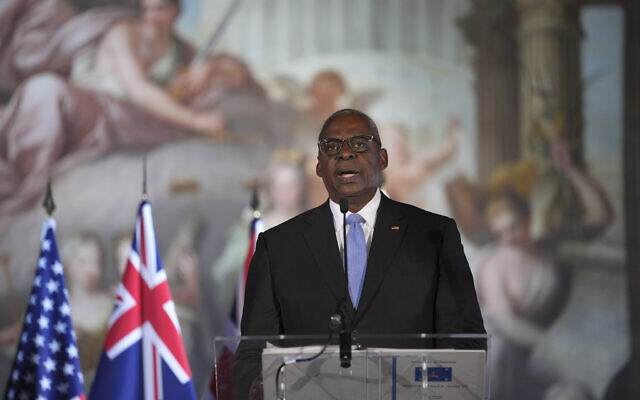 US Secretary of Defense Lloyd Austin speaks during a press conference at the AUKUS Defence Ministers Meeting at Old Royal Naval College, Greenwich, London, September 26, 2024. (AP Photo/Kin Cheung, Pool)