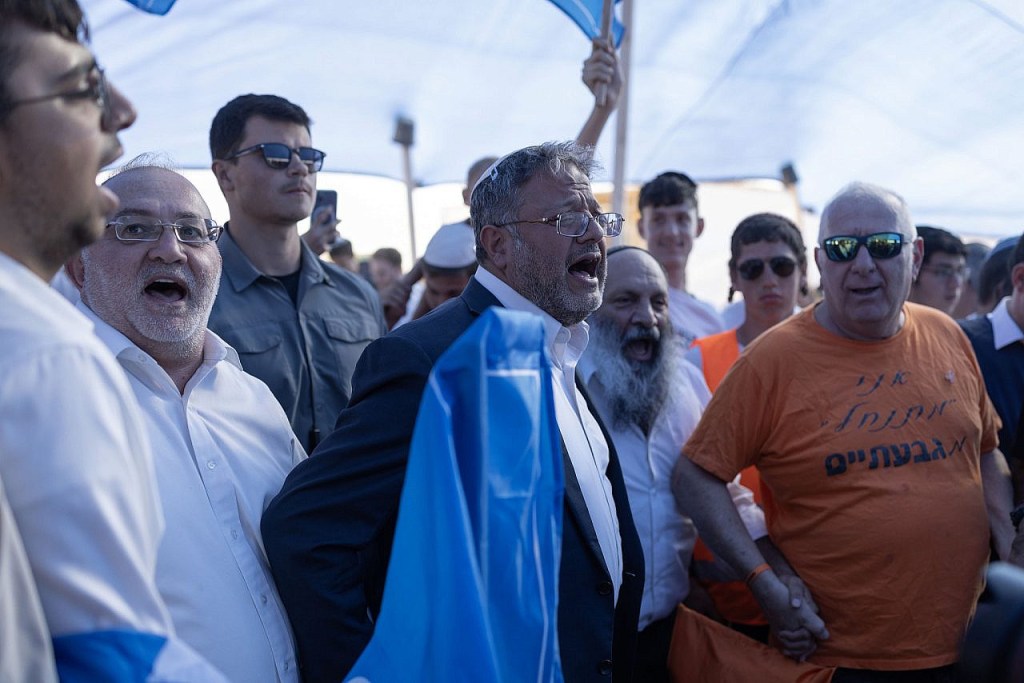 It wasn’t until around 3 p.m., when some attendees had already made their way to the parking lot to leave, that the most high-profile guests began to arrive: Social Equality and Women’s Empowerment Minister May Golan of Likud, followed by National Security Minister Itamar Ben Gvir of Otzma Yehudit, and finally Finance Minister Bezalel Smotrich of the Religious Zionist Party. Ben Gvir danced with some of the attendees before taking the stage. He wished Netanyahu, who was not present, a happy birthday, and then told the crowd that Israel’s “change of conception” since October 7 is bearing fruit.