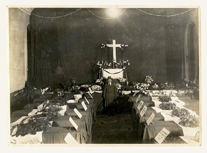 The period covered in #ImagingConflict saw the 1st Irish revolution in which the public played such a key role documenting. These images are from a Republican funeral scenes showing 13 coffins lying in state in the Hardwicke Hall buried in Glasnevin. https://museum.ie/en-IE/Museums/