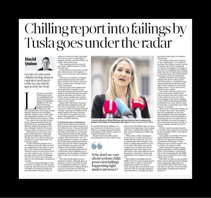 or Tusla about the report and the answer was no. That is very hard to credit….Why don’t we seem to care as much about serious child protection failings today, happening right under our noses and the gaze of the State? And why does no one ever seem to be held accountable, including government ministers?” asks