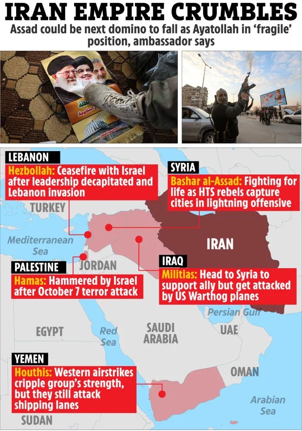 Iran’s fragile empire is crumbling – Syrian rebels’ blitz on Putin & Assad is next domino to fall, says ex-ambassador. Hopefully the People of Iran, will Overthrow the Evil Ayatollah, and get their Freedom.