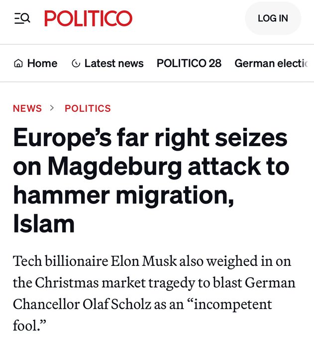 22 Dec, 2024 Uncategorized Europe needs to Wake up, or there will be a War on the Streets of many Countries? “Brussels cannot turn Hungary into Magdeburg. They want to impose migration regulations on us, the risk of which is clear as day. I won’t allow that.” —Viktor Orbán Posted by Fred Bassett @iamyesyouareno Apparently it’s far right to not want innocent people getting murdered in the streets. The legacy media is the enemy of the people. Share this: Click to share on X (Opens in new window) X Click to share on Facebook (Opens in new window) Facebook Click to share on LinkedIn (Opens in new window) LinkedIn Click to share on Reddit (Opens in new window) Reddit Click to email a link to a friend (Opens in new window) Email More Click to print (Opens in new window) Print Like Loading... Related