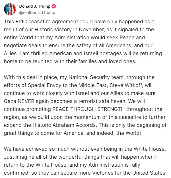 18 Jan, 2025 Uncategorized Statement from Donald Trump. Posted by Fred Bassett Share this: Share on X (Opens in new window) X Share on Facebook (Opens in new window) Facebook Share on LinkedIn (Opens in new window) LinkedIn Share on Reddit (Opens in new window) Reddit Email a link to a friend (Opens in new window) Email More Print (Opens in new window) Print Like Loading... Related