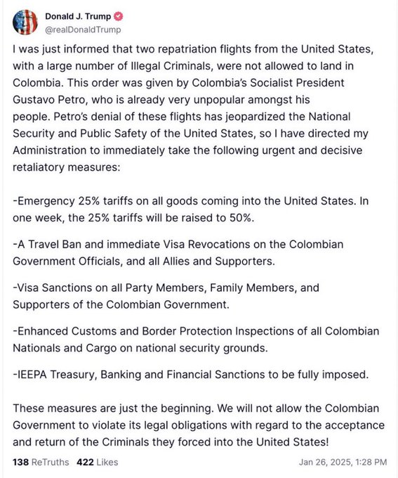 BREAKING: Trump announces sanctions & tariffs against Colombia. It will start with 25% tariffs on Colombian goods, which will increase to 50% after a week. It was made in response to far-left Colombian President Gustavo Petro refusing to receive Trump’s deportation flights