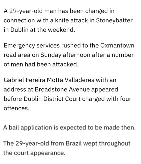 BREAKING! A Brazilian man named Gabriel Fereira Motta Valladeres has been charged with the mass stabbing in Dublin. He entered Ireland in 2022 and was out on bail for drugs offences when he committed the attack. So Fereira, was known to Gardai, Why all the Lies from Labour, and the rest of the Traitors?