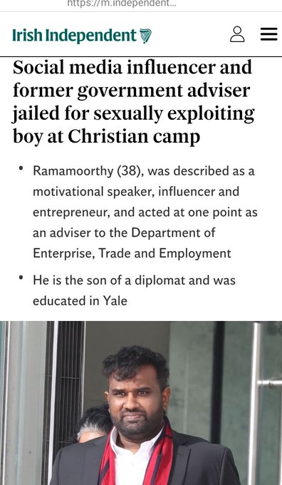 At an earlier sentence hearing, Detective Inspector Sean White told Shaun Smyth BL, prosecuting, that the victim in the case first met Ramamoorthy when he was volunteering at a Christian camp, where he was described as “very friendly, charismatic and popular”.