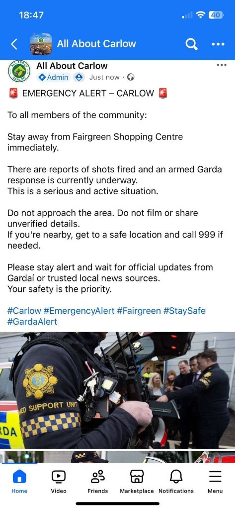 2 Jun, 2025 Uncategorized Gunman opening fire in Carlow Fairgreen shopping center Posted by Fred Bassett Anthony Casey @AnthonyLCasey Share this: Click to share on X (Opens in new window) X Click to share on Facebook (Opens in new window) Facebook Click to share on LinkedIn (Opens in new window) LinkedIn Click to share on Reddit (Opens in new window) Reddit Click to email a link to a friend (Opens in new window) Email More Click to print (Opens in new window) Print Like Loading... Related