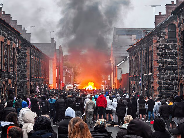 But rioting then broke out. Barricades were erected and fires lit. Some masked youths yelled ‘paedo-protectors’ as the emergency services arrived to battle blazes they had started. Houses were attacked and a boat was even overturned in the street.