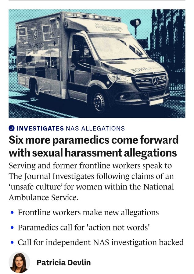 Six more paramedics come forward with sexual harassment allegations – Patricia Devlin Serving and former frontline workers speak to The Journal Investigates following claims of an ‘unsafe culture’ for women within the National Ambulance Service. #NAS https://thejournal.ie/national-ambulance-service-sexual-harassment-6760534-Jul2025/