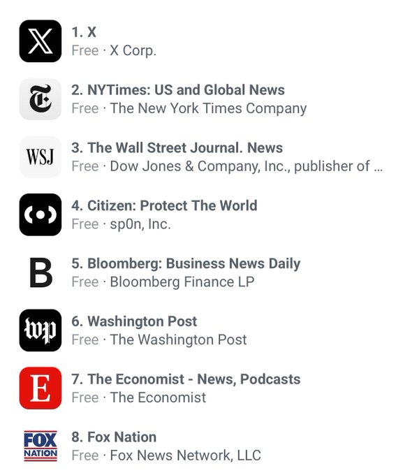 21 Aug, 2025 Uncategorized 𝕏 is replacing legacy news and continues to lead as the top news app. We are the media now! Posted by Fred Bassett Share this: Click to share on X (Opens in new window) X Click to share on Facebook (Opens in new window) Facebook Click to share on LinkedIn (Opens in new window) LinkedIn Click to share on Reddit (Opens in new window) Reddit Click to email a link to a friend (Opens in new window) Email More Click to print (Opens in new window) Print Like Loading... Related