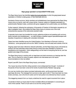 Our Rape Gang Inquiry has today released research detailing eighty-five local Authorities in which the gang-based sexual Exploitation of children is taking place, or has historically done so. This is one of the most comprehensive exposes of the Rape Gang Scandal to date