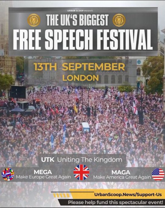 Urgent Call for Peace at the September 13th Free Speech Festival in London No masks, no alcohol, no violence—this fight is too important to let agent provocateurs derail our movement. Please share this everywhere!!! #FreeSpeechFestival #TommyRobinson #UniteTheKingdom