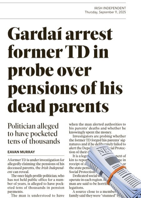 Gardaí Arrest former TD in probe over his dead Parents’ Pensions -Eavan Murray The once high-profile Politician, who has not held public office for a number of years, is alleged to have Pocketed tens of thousands in pension payments. The man is understood to have claimed more than €500 per week over a prolonged Period