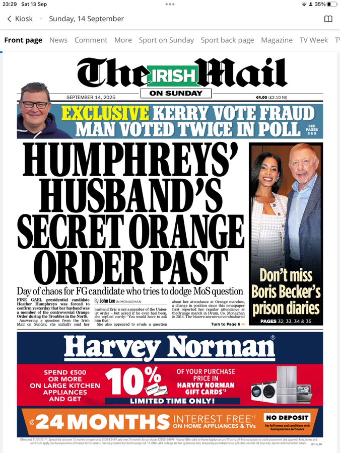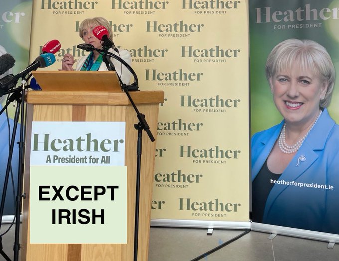 Day of drama as FG Presidential candidate dodges question on Husband’s Membership of the Orange Order, then party admits he was. Her claims that she stopped going to Orange Parades? Don’t stand up either. Tomorrow’s. Heather a True, Orange Lady. Orange Prods are Bigoted, Bitter Anti Irish Bastoons, they Hate the Gaelic Culture, especially Hurling and Football .Her Grandfather signed the Ulster Covenant “Ulster will Fight and Ulster will be Right” Carson Green Paper on Disabilities, Whistleblower in the Department of Agriculture, Failed to learn Irish when Gaeltacht Minister for 4 years She has more Baggage than Samsonite