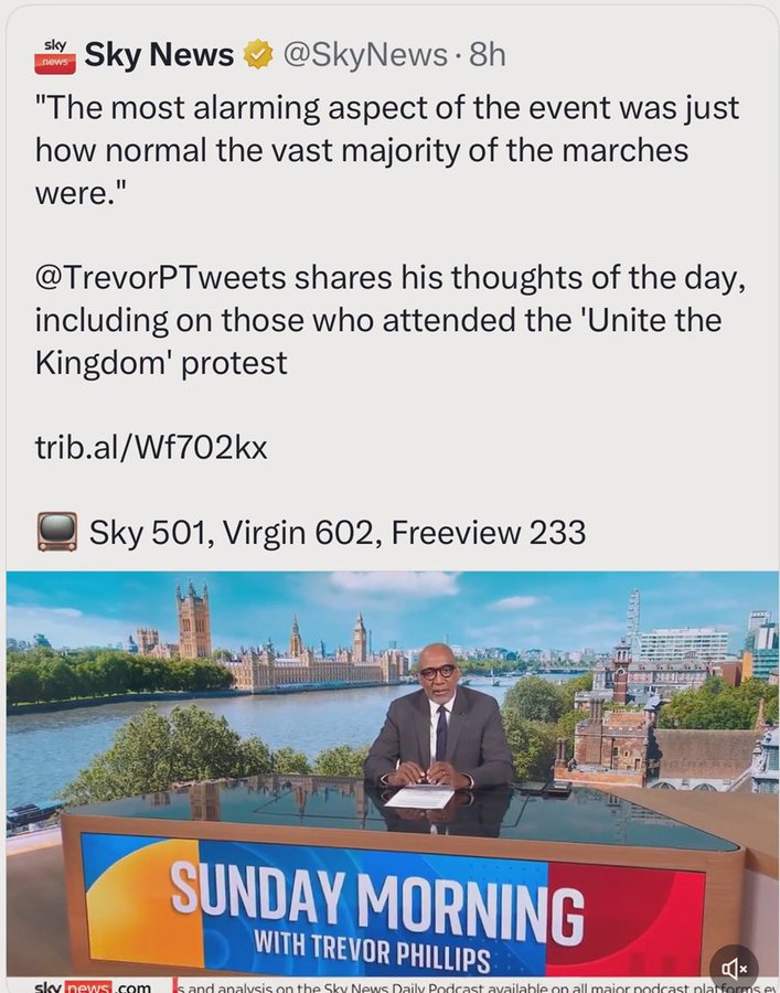 SKY NEWS REMOVES CLIP OF HOST PRAISING TOMMY ROBINSON Their X post has now been Removed after it was retweeted many times because of the Fair appraisal host Trevor Phillips gave of the Unite the Kingdom March SKY NEWS COULDN’T ALLOW THAT THEY ARE CENSORING THEIR OWN HOSTS. Main Media are Hostile to the People, WHO IS BEHIND THIS, WOKE???