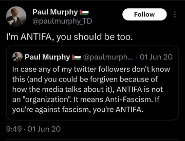 Now that the USA is moving to designate Antifa as a terrorist organization, there will be some very nervous individuals in Irish politics, law enforcement and NGO’s. The last garda commissioner Drew Harris once gave an interview from a garda station while standing in front of an Antifa sticker. The official garda X accounts have also been caught liking posts from well known Antifa operatives. And a member of the Irish parliament Paul Murphy has proudly declared his association with the Terror group.