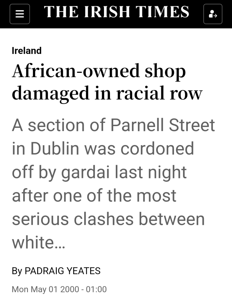 The first Race riots in Ireland happened in the year 2000 when illegal Nigerian “Refugees” started demanding Protection money from local businesses on Parnell Street. But of course the Irish Fake News would have you believe that the illegal Nigerians could do no wrong and were victims of Irish “racists” when in reality they were dealing drugs and running protection rackets on Parnell Street. If we had any kind of proper Justice system all those illegal Nigerians on Parnell Street should have been Deported when they first started coming to Ireland.