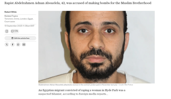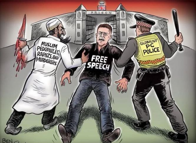 ‘s cabal – the one (left) below was accused of terrorism by Egypt, and raped a woman in the UK after being ‘welcomed’. The man who has opposed terrorism for years – Tommy Robinson – is charged on the flimsiest of pretences to get access to his phone. Damning.