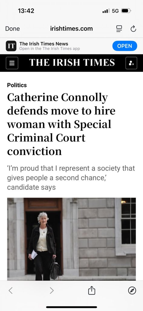 If Catherine Connolly does not understand that it is wrong & dangerous to hire someone who was imprisoned on firearms charges to work in the Oireachtas-she is unfit for the office and she now seeks. There are just so many errors of judgement that should be excused.