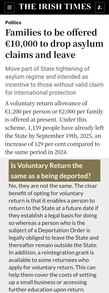 Ok now they’re just taking the absolute Piss out of us. The Government is paying personal grants of up to €10,000 for asylum seekers to leave Ireland voluntarily. Up to €2,318,000 has already been paid out to 1,159 people in 2025. But It gets worse! They’re not barred from Ireland, they can legally return on a visa or permit afterwards!