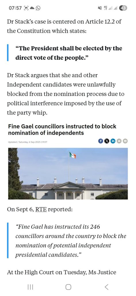 14 Oct, 2025 Uncategorized Tomorrow at the High Court West Clare woman takes on the State over ‘Unlawful’ Blocking of Votes by FG + FF In the Public interest Posted by Fred Bassett Louise Roseingrave @blueskylou Share this: Click to share on X (Opens in new window) X Click to share on Facebook (Opens in new window) Facebook Click to share on LinkedIn (Opens in new window) LinkedIn Click to share on Reddit (Opens in new window) Reddit Click to email a link to a friend (Opens in new window) Email More Click to print (Opens in new window) Print Like Loading... Related