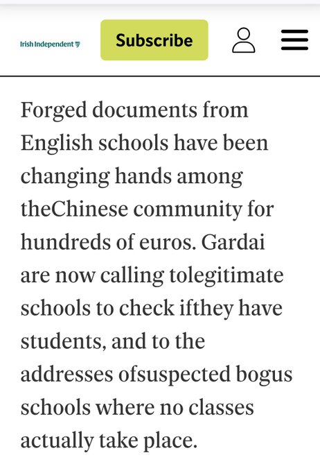 17 Oct, 2025 Uncategorized Illegal Chinese criminals have been using “English language schools” to buy bogus visas into Ireland since at least the early 2000s Posted by Fred Bassett #MigrantCrime #HowIrelandWorks #IrelandisFull https://m.independent.ie/news/schools-f Taxi Dave @DublinTaxiDave Share this: Click to share on X (Opens in new window) X Click to share on Facebook (Opens in new window) Facebook Click to share on LinkedIn (Opens in new window) LinkedIn Click to share on Reddit (Opens in new window) Reddit Click to email a link to a friend (Opens in new window) Email More Click to print (Opens in new window) Print Like Loading... Related