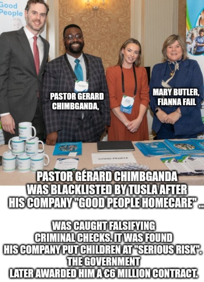 How many more immigrant “Christian pastors” have to falsify Garda vetting (for staff working with children in “care) before the government stops giving them contracts? He was caught out doing it by Tusla, and then the government gave him a 6 million contract? Here he is pictured with Fianna Fail chief whip Mary Butler, who was the Minister for Health when “GOOD PEOPLE” HOMECARE was given the contract. People need to start connecting all the dots here or our elderly children, and people with disabilities have NO chance. The pastors team is listed in the comments.