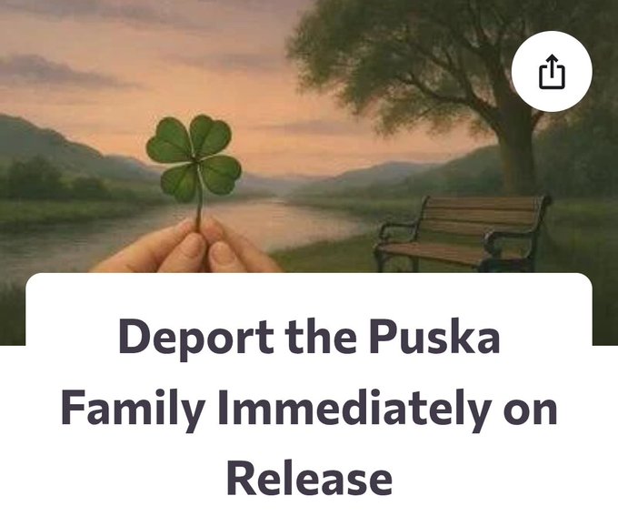 26 Oct, 2025 Uncategorized Someone started a petition to have the Puska’s deported upon release. Link below. Posted by Fred Bassett Susanne Delaney @SuzieD755164 Share this: Click to share on X (Opens in new window) X Click to share on Facebook (Opens in new window) Facebook Click to share on LinkedIn (Opens in new window) LinkedIn Click to share on Reddit (Opens in new window) Reddit Click to email a link to a friend (Opens in new window) Email More Click to print (Opens in new window) Print Like Loading... Related