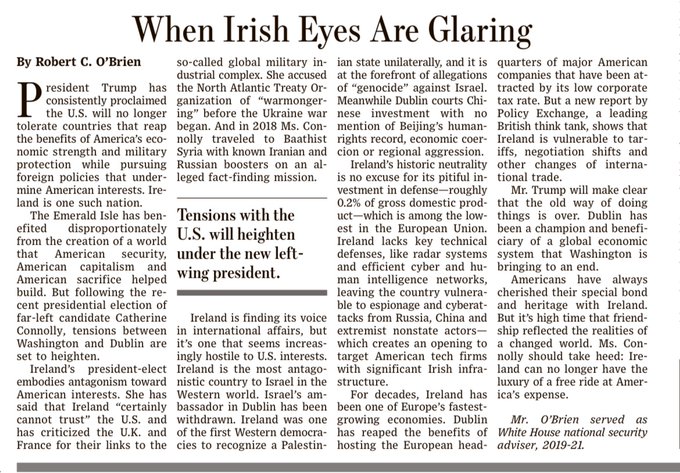 7 Nov, 2025 Uncategorized Another Ireland-hostile opinion piece in the The Wall Street Journal, the paper of record of corporate America. Free-riding needs to end. Leadership in Dublin is needed urgently. Posted by Fred Bassett Dan O’Brien @danobrien20 Share this: Share on X (Opens in new window) X Share on Facebook (Opens in new window) Facebook Share on LinkedIn (Opens in new window) LinkedIn Share on Reddit (Opens in new window) Reddit Email a link to a friend (Opens in new window) Email More Print (Opens in new window) Print Like Loading... Related