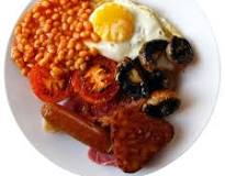 back bacon, sausages (usually pork), eggs (fried, poached or scrambled), fried or grilled tomatoes, fried mushrooms, black pudding, baked beans, and toast or fried bread.