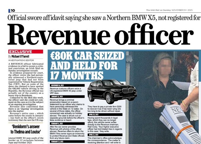A REVENUE officer fabricated evidence in a bid to secure a criminal conviction, an Irish Mail on Sunday investigation reveals. Michael O’Farrell In evidence prepared for court, the officer swore she had personally witnessed a Northern-registered jeep that had not been registered for Vehicle Registration Tax (#VRT). But on some of the dates she claimed to have spotted the €80,000 vehicle driving in the Republic, the Revenue official was actually out of the country on a boozy trip to Benidorm.