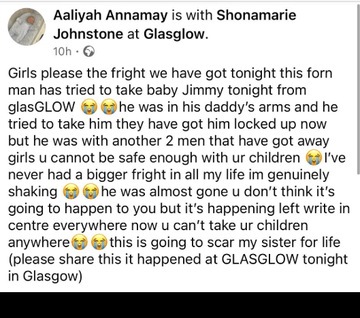 GANG TRIED TO SNATCH BABY FROM FATHERS ARMS A man was attending the GlasGlow lights events in Glasgow last night when a Muslim Gang tried to take his baby out of his arms and make a runner. Luckily one was caught but the other two got away WE SHOULDN’T HAVE TO LIVE LIKE THIS