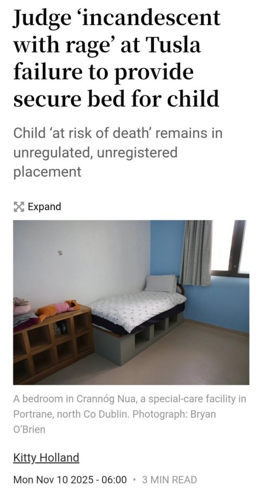 Judge ‘Incandescent with Rage’ at Tusla failure to provide secure bed for child – Kitty Holland Dublin District Court Judge John Campbell said on Friday the preteen Child “should be getting ready for Santa Claus”, but instead was worrying about where they would be at Christmas.