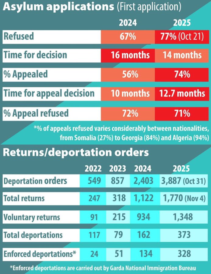 17 Nov, 2025 Uncategorized Every Asylum Seeker arriving in Ireland is a Scammer and the government is well Aware. 77% of Asylum applications made in 2025 were Rejected. But only 373 Deportations have been carried out. Posted by Fred Bassett MichaeloKeeffe Share this: Click to share on X (Opens in new window) X Click to share on Facebook (Opens in new window) Facebook Click to share on LinkedIn (Opens in new window) LinkedIn Click to share on Reddit (Opens in new window) Reddit Click to email a link to a friend (Opens in new window) Email More Click to print (Opens in new window) Print Like Loading... Related
