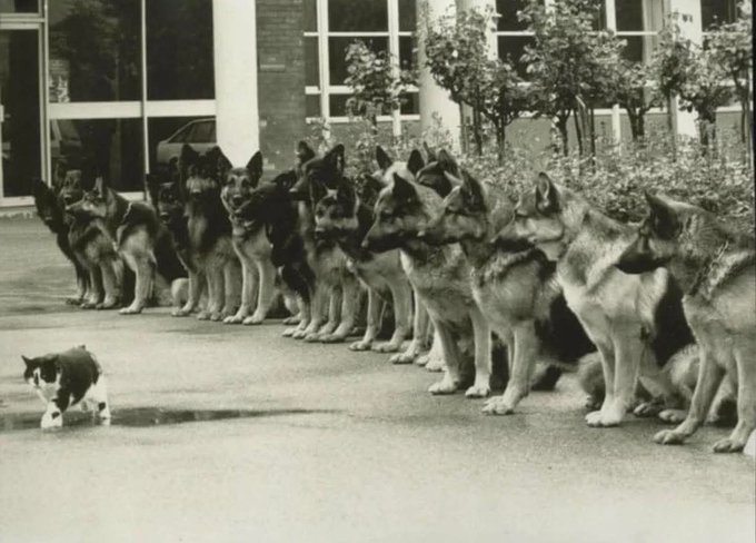 A photo of the final exam for police service dogs where the dogs must remain calm in front of a cat taken in 1987… German Shepherds are widely used in police work due to their intelligence, trainability, and strong Protective instincts. The breed is renowned for its ability to perform various Police roles, including Detecting contraband and locating missing people. German Shepherds are highly valued for their focus and discipline in demanding work environments. The dogs in the photo are demonstrating Discipline by remaining in formation despite the distraction of the cat. © Historical Photos
