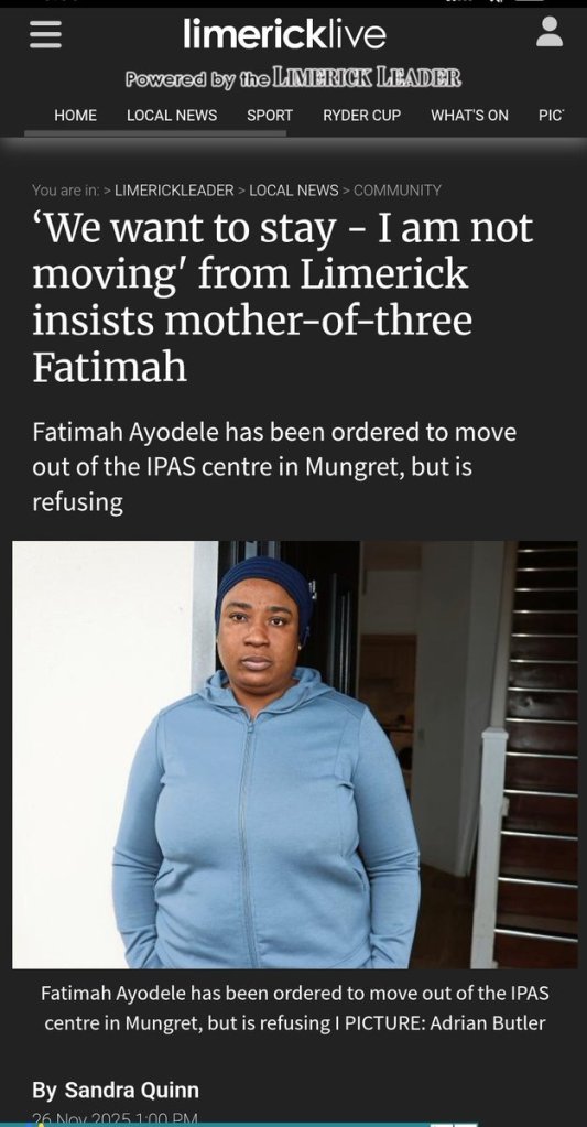 Illegal South African Migrant claiming Asylum says that she “Refuses” to move from an Asylum seeker centre in Limerick She is working and living there for free with her family paid for by Irish taxpayers. South Africa is listed as a “safe country of origin by the Irish government. The mother of 3 is the only person left in the centre and said “I can’t afford to jeopardise my children’s education”. Why are we tolerating these illegal Migrants making demands of us. She needs to be Deported from Ireland. DEPORT THE ALIEN BACK TO AFRICA.