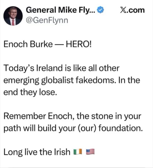 6 Dec, 2025 Uncategorized Thank you General Flynn the Irish government must be taken down. Posted by Fred Bassett Conversation Captain Kieran Kelly Share this: Click to share on X (Opens in new window) X Click to share on Facebook (Opens in new window) Facebook Click to share on LinkedIn (Opens in new window) LinkedIn Click to share on Reddit (Opens in new window) Reddit Click to email a link to a friend (Opens in new window) Email More Click to print (Opens in new window) Print Like Loading... Related
