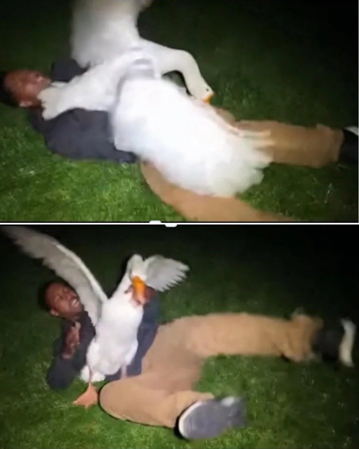 Police say a man was taken into custody last night after attempting to steal a Goose from a local park but the Goose took care of the situation long before officers arrived. When police reached the scene, they found the man sprawled on the ground, shouting for help, while the Goose stood over him like a furious security guard: wings spread wide, hissing, and refusing to let him get up. By the time officers separated the two, the bird had already “made the arrest.” One responding officer summed it up perfectly: “Honestly… the goose did our job for us. Get a guard goose i say. GOOSE SORTS OUT MIGRANT.